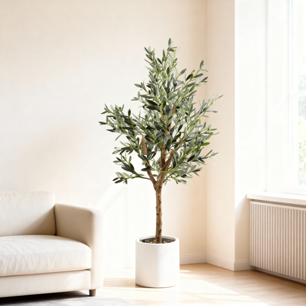Este Olivo de Tronco Real de 160 cm presenta madera auténtica para el tronco, combinada con hojas de olivo multicolores y frutos realistas en tonos verde, amarillo y oliva oscuro. La capa decorativa de guijarros en la maceta blanca añade un toque orgánico y premium. Su silueta cálida y natural la hace ideal para decoración del hogar, merchandising minorista y interiores comerciales de alta gama.
