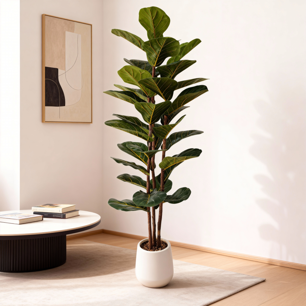 Sus hojas gruesas, de color cuero, de un verde profundo, sus venas hundidas y sus entrenudos cortos crean un follaje denso y elegante, ideal para compradores que prefieren una higuera de hoja sintética de estilo diseñador de alta calidad, comúnmente vista en las selecciones de higueras de hoja falsa de violín del mercado mundial .