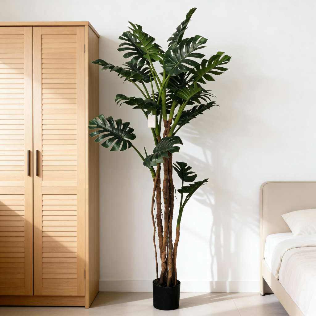 Este árbol artificial de monstera de 220 cm presenta un tronco de estilo maduro con raíces aéreas hechas a mano, capturando el icónico patrón de crecimiento de grandes especies de Monstera Deliciosa y queso suizo. Las hojas de un verde más oscuro y su estructura robusta le dan una sensación sofisticada y realista, ideal para interiores de lujo y proyectos B2B comerciales que buscan un aspecto premium de faux monstera / árbol de monstera artificial .