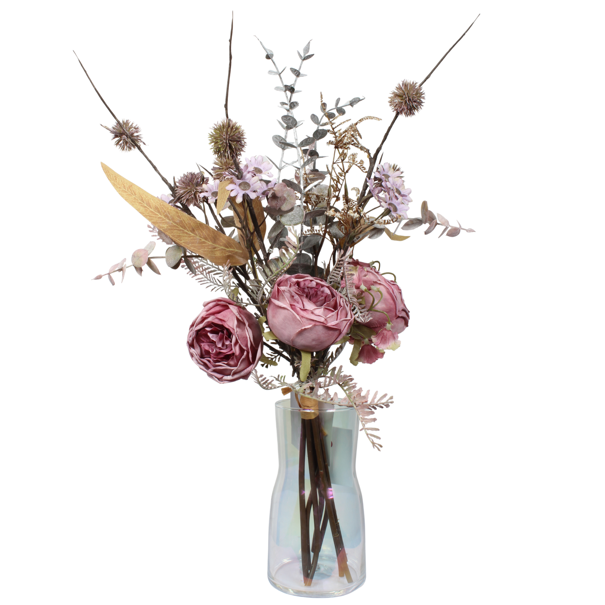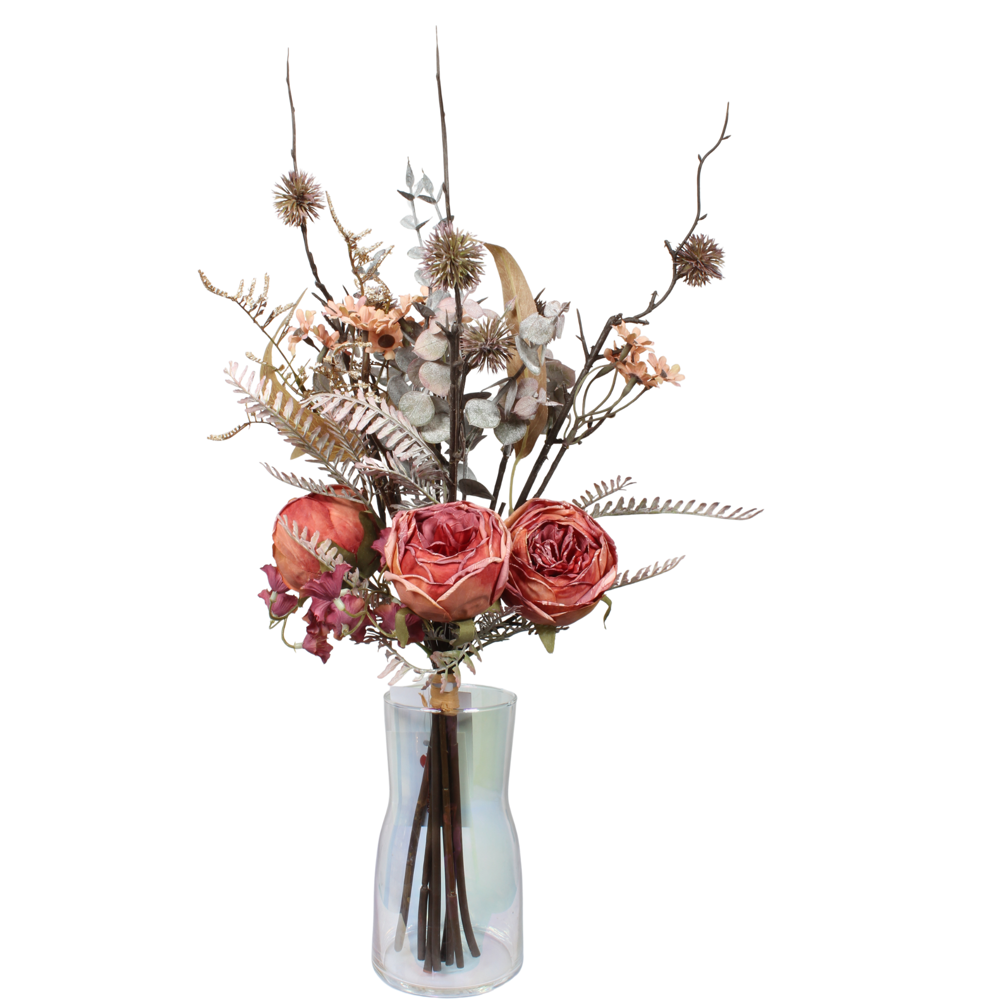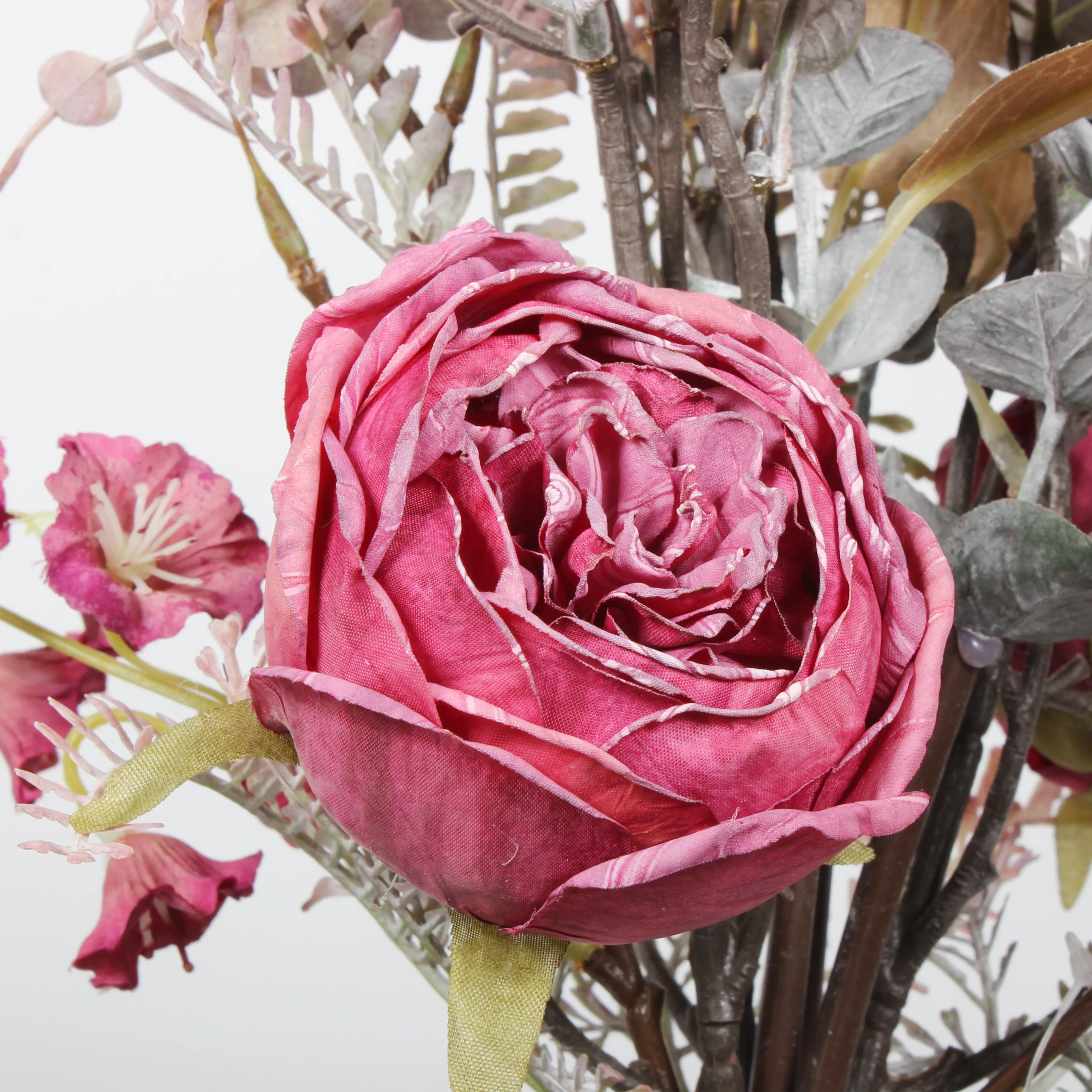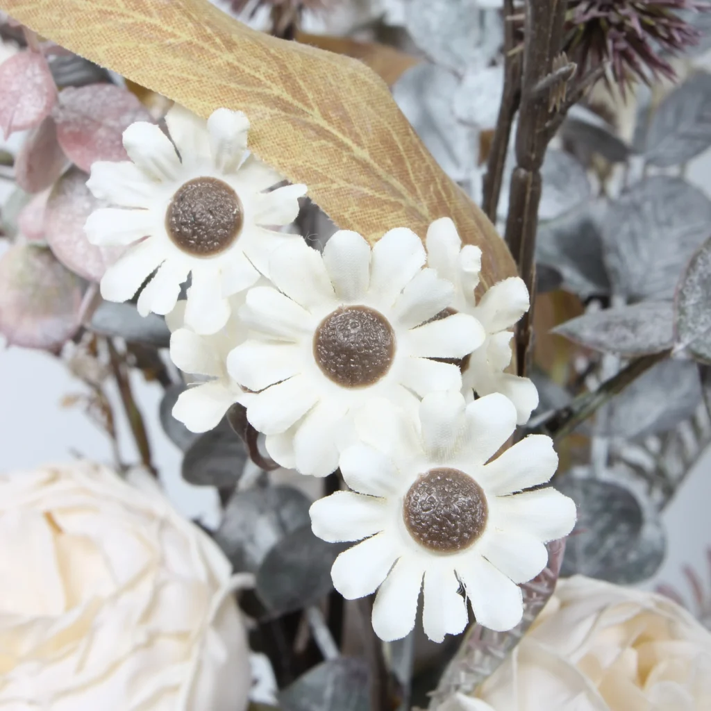 Este ramo mixto de rosas vintage artificiales de 53 cm presenta tres rosas corazón con volantes sostenidas por campanillas, margaritas, eucalipto y follaje texturizado. La paleta vintage inspirada en flores secas crea una profundidad suave y un romance elegante, ideal para el estilo de boda y el mobiliario floral para el hogar.