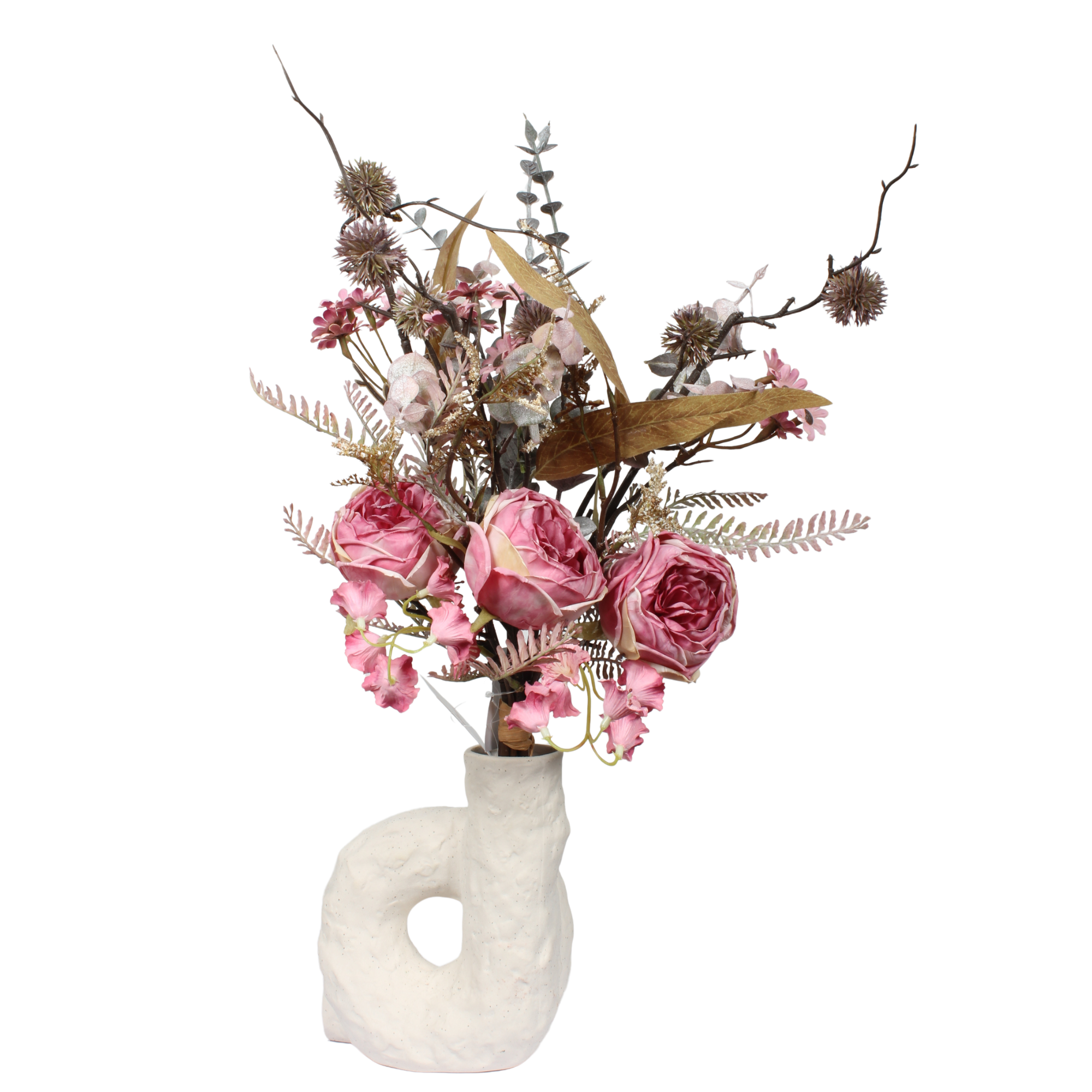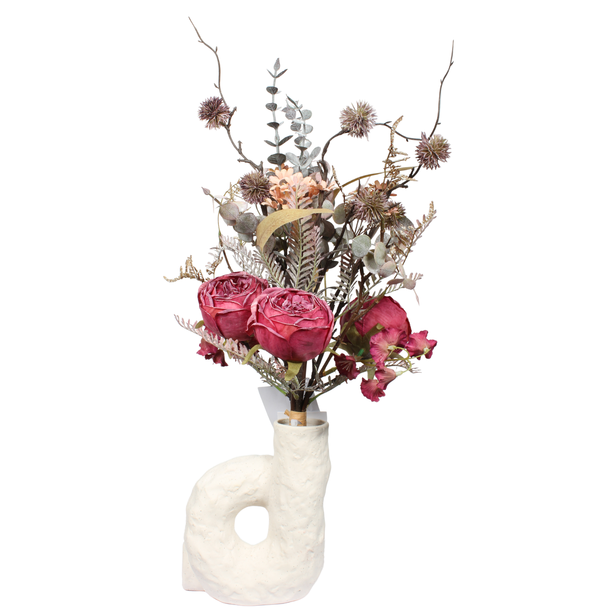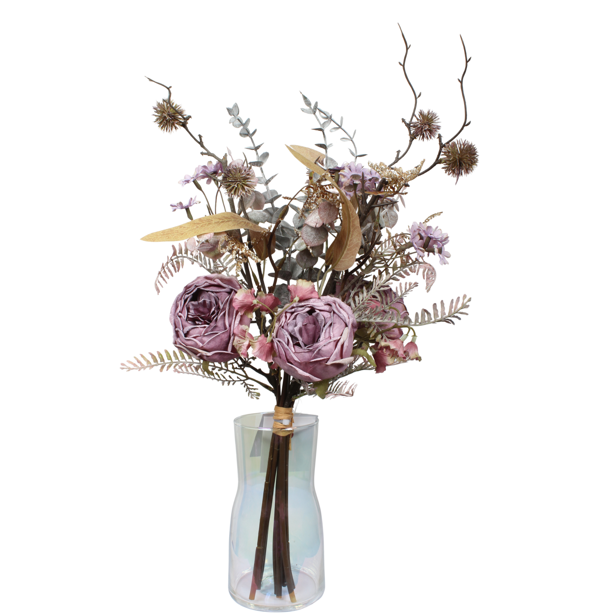 Este ramo mixto de rosas vintage artificiales de 53 cm presenta tres rosas corazón con volantes sostenidas por campanillas, margaritas, eucalipto y follaje texturizado. La paleta vintage inspirada en flores secas crea una profundidad suave y un romance elegante, ideal para el estilo de boda y el mobiliario floral para el hogar.