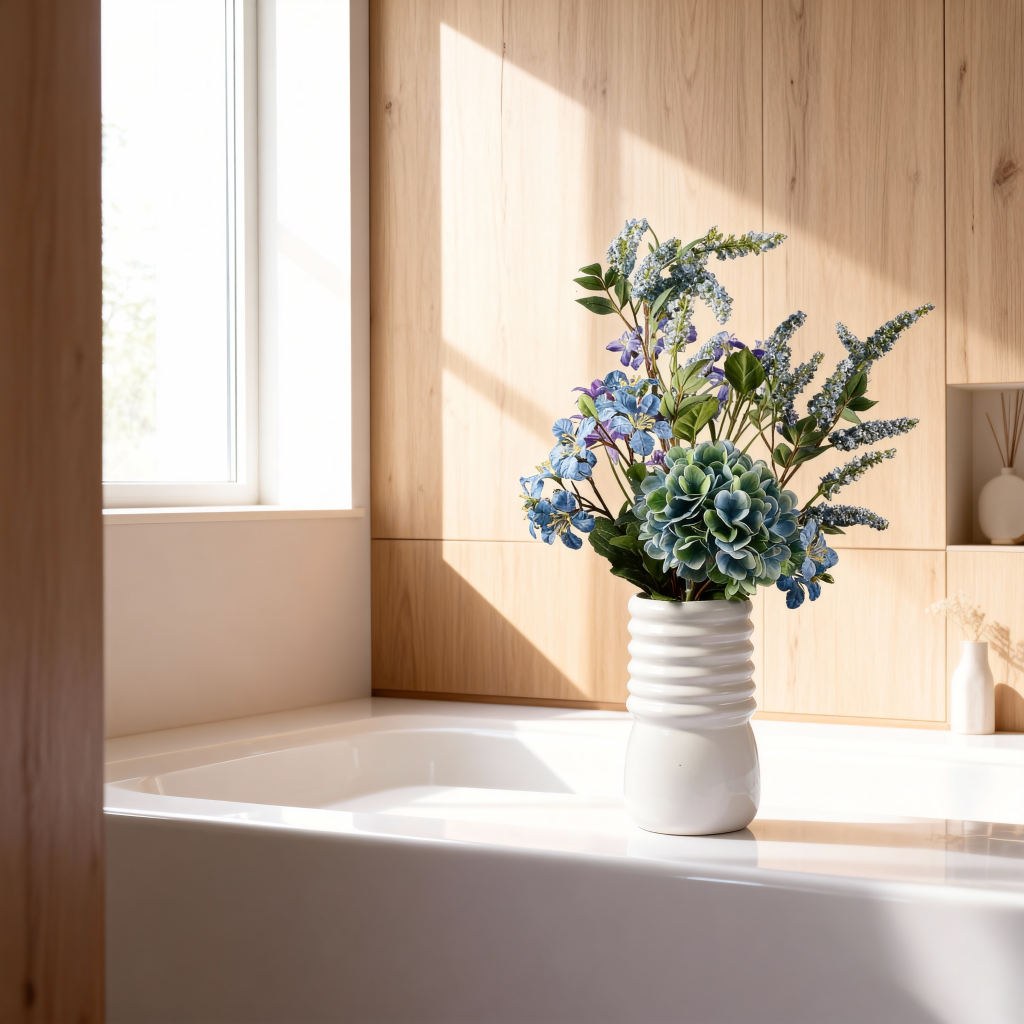 Este arreglo floral artificial de 67 cm presenta hortensias azules como flores focales, combinadas con tallos estacionales complementarios para formar una composición triangular refinada. La disposición se asienta en un jarrón cerámico mate de color blanco roto, creando un aspecto equilibrado, moderno y artístico, adecuado tanto para espacios domésticos como comerciales.