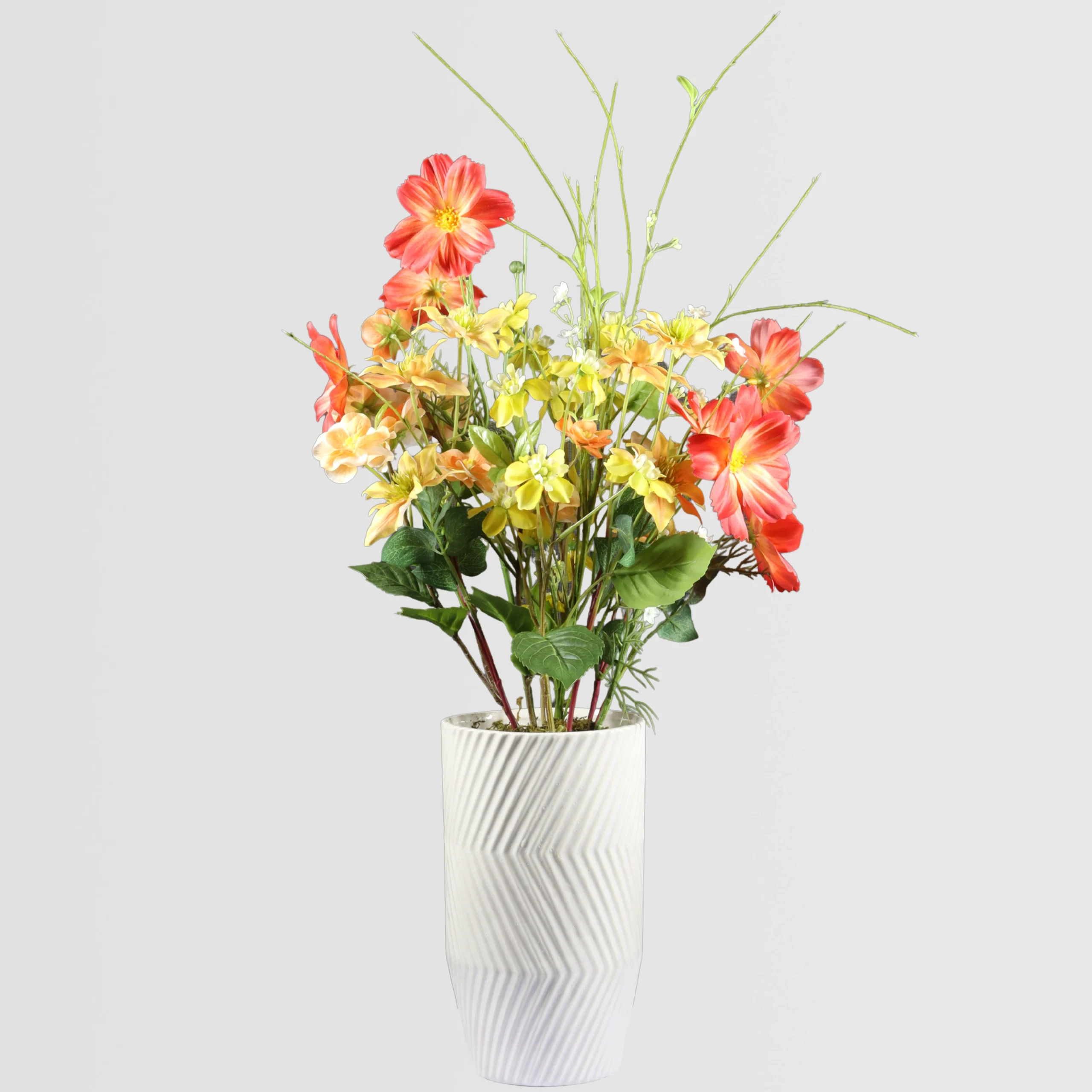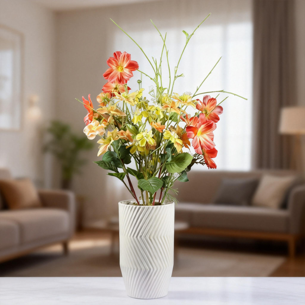 Este arreglo floral Artificial Cosmos de 74 cm presenta una mezcla animada de cosmos, ranúnculos, escabiosa y clemátides, compuesto en un jarrón cerámico blanco con detalles de rayas verticales talladas. El arreglo resalta tonos cálidos amarillos, naranjas y rojos, creando un ritmo visual audaz pero armonioso con un aire natural inspirado en el jardín.