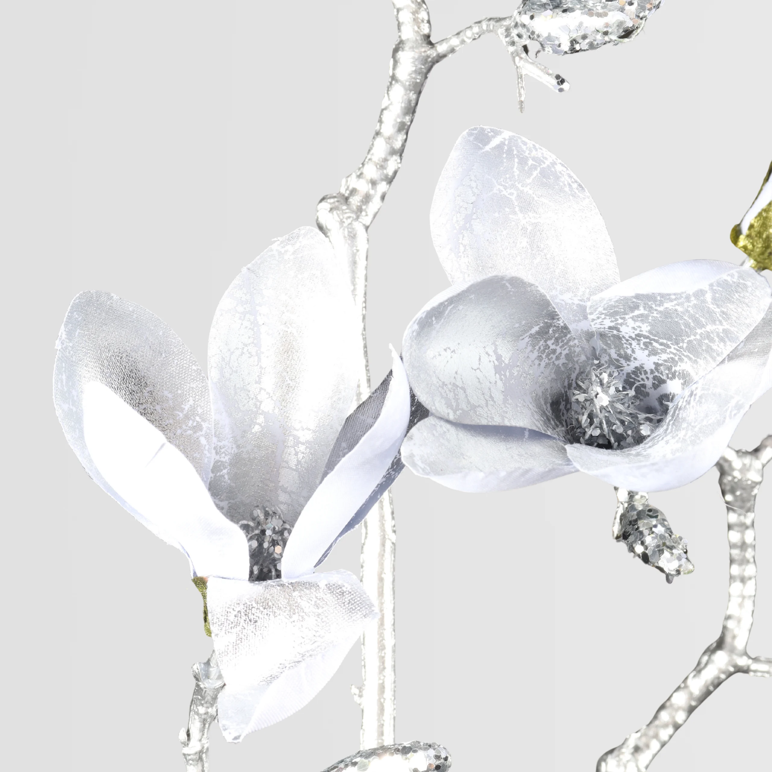 Este tallo artificial de magnolia de 91 cm presenta pétalos de seda suaves con un brillo sutil y refinado, y un tallo reflectante metálico dorado-plateado que capta la luz de forma preciosa. La combinación de un suave brillo y flores de magnolia esculpidas crea una estética otoño-invierno premium, perfecta para ramos navideños, instalaciones festivas y exhibiciones de lujo en tiendas.