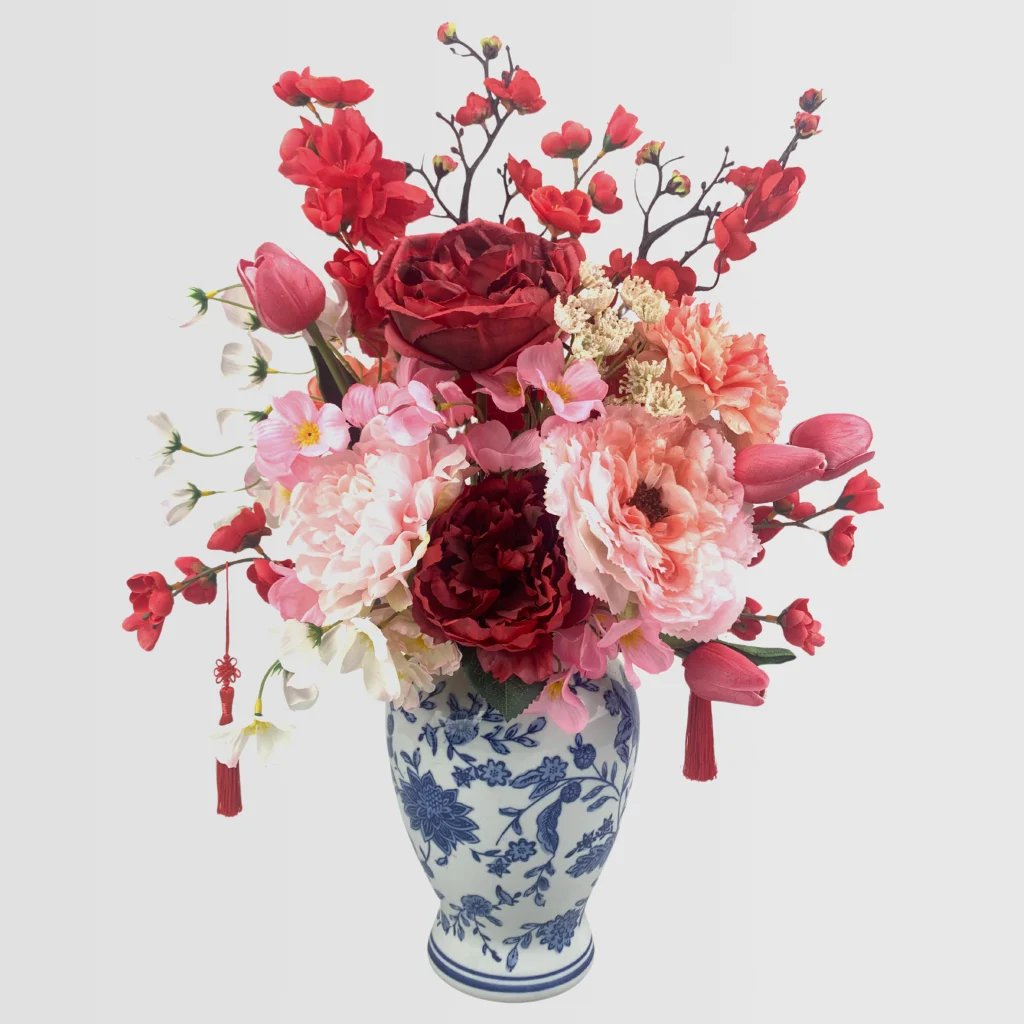 Este arreglo de flores rojas artificiales de 57 cm combina peonías, tulipanes, claveles, ramas de ciruelo y delicadas flores blancas de acento para crear una composición rica y lujosa. Envuelto en un jarrón clásico de porcelana azul y blanco con patrones florales tradicionales y acabado con adornos rojos de borla, ofrece una fuerte estética oriental y un simbolismo auspicioso.