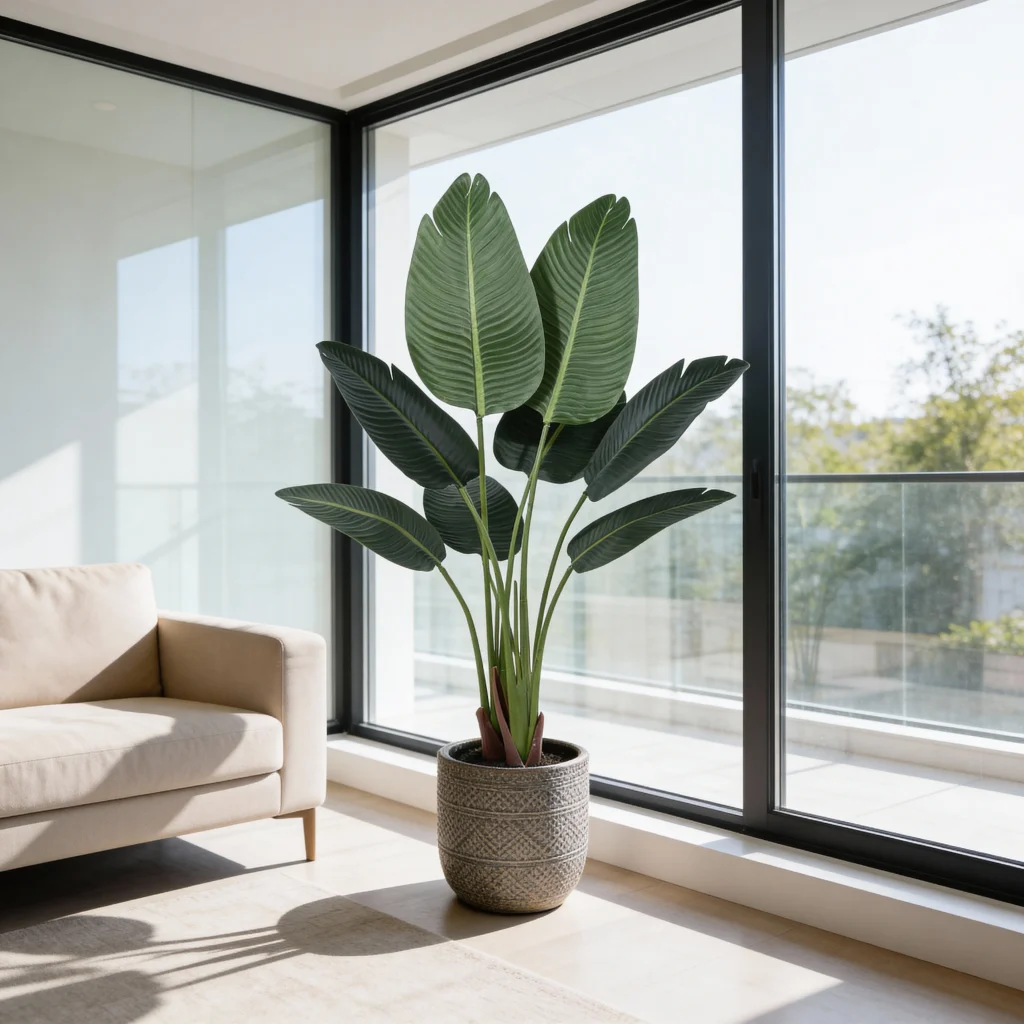 This 120cm Artificial Traveller Palm Tree (KD) features fabric-based matte leaves made from sardine cloth layered with plastic support, creating a soft, understated, and premium look. The non-glossy finish delivers a refined high-end artificial plant aesthetic, ideal for compact interiors, narrow corridors, and sophisticated commercial spaces where subtle texture matters more than scale.