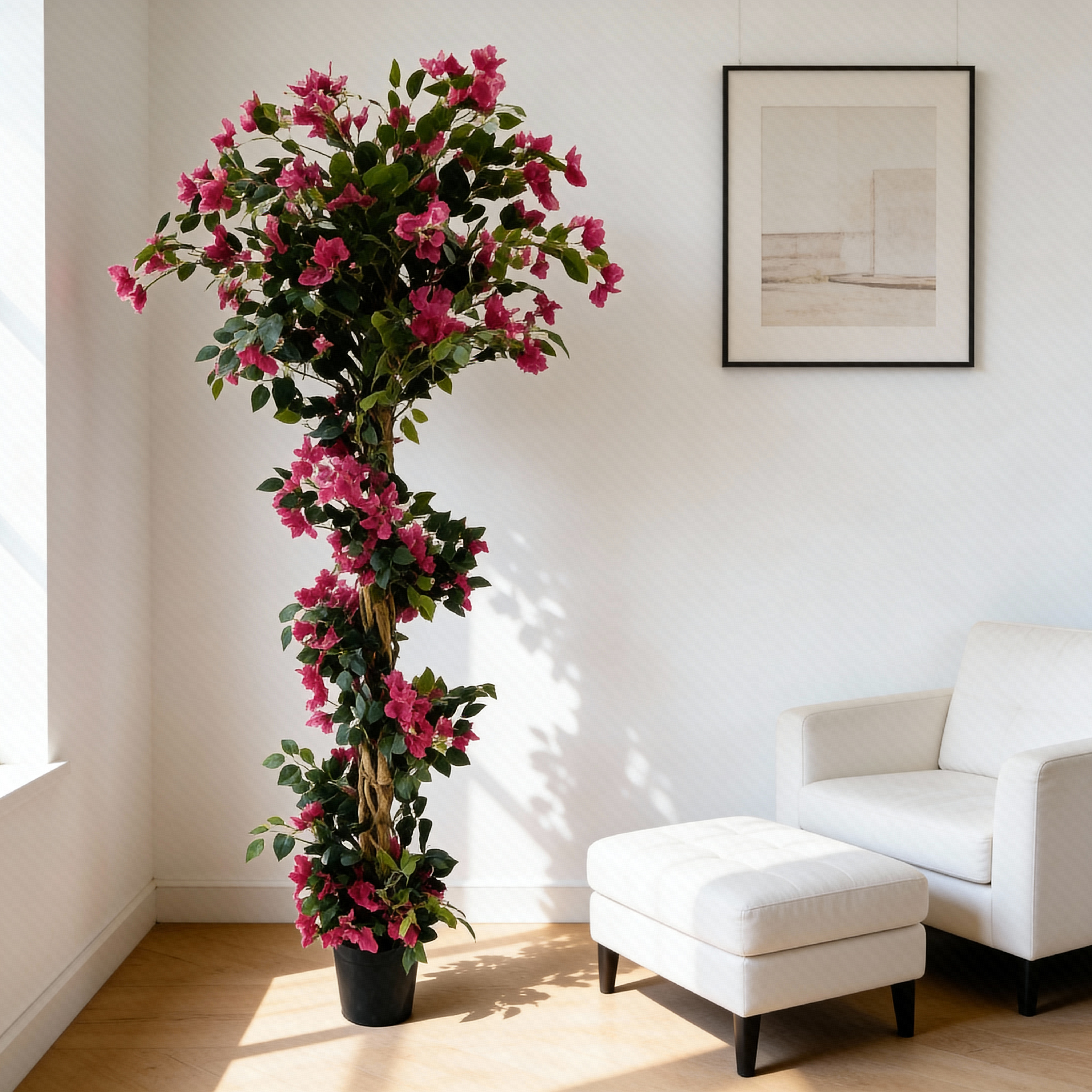 This 185cm Artificial Bougainvillea Flower Tree features abundant, vivid blooms that wrap naturally around the trunk in a cascading, climbing style. With fewer leaves and richly layered petals, the silhouette emphasizes fullness, color, and softness—perfect for standout displays, modern interiors, and B2B décor projects seeking eye-catching floral energy.