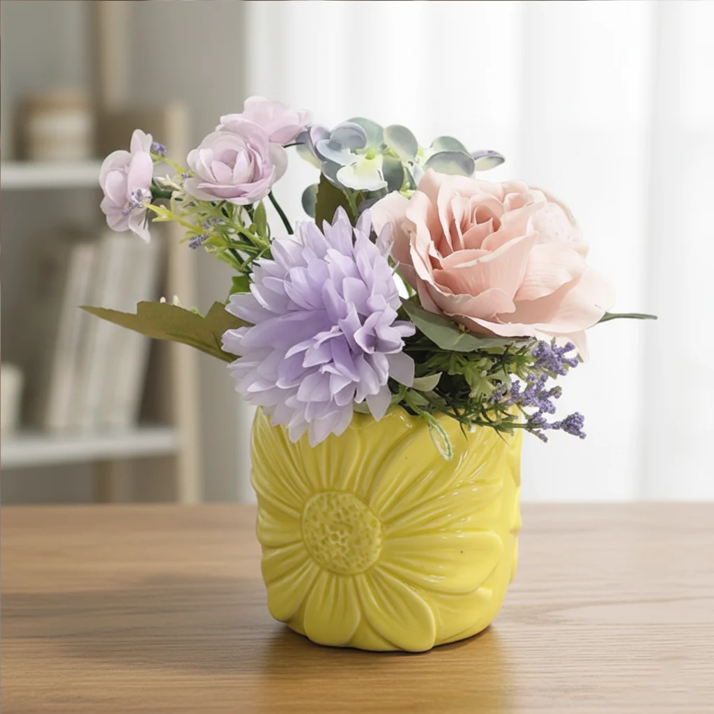 • Material: Mixed faux florals + Light yellow carved ceramic vase