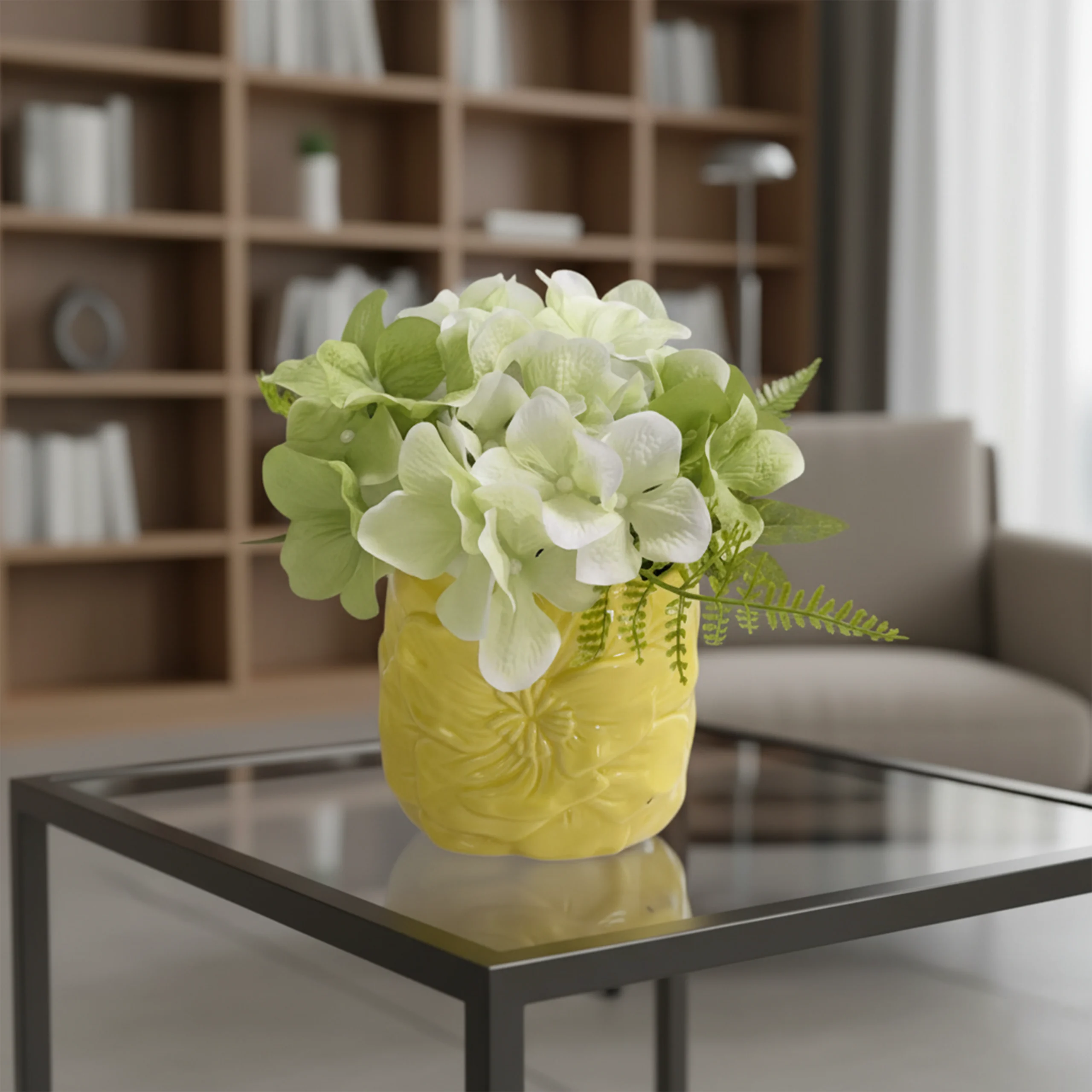 • Material: Mixed Hydrangea florals + Light yellow carved ceramic vase