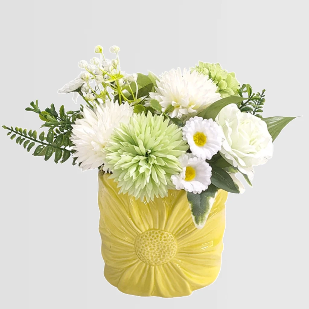 • Material: Mixed faux florals + Light yellow carved ceramic vase