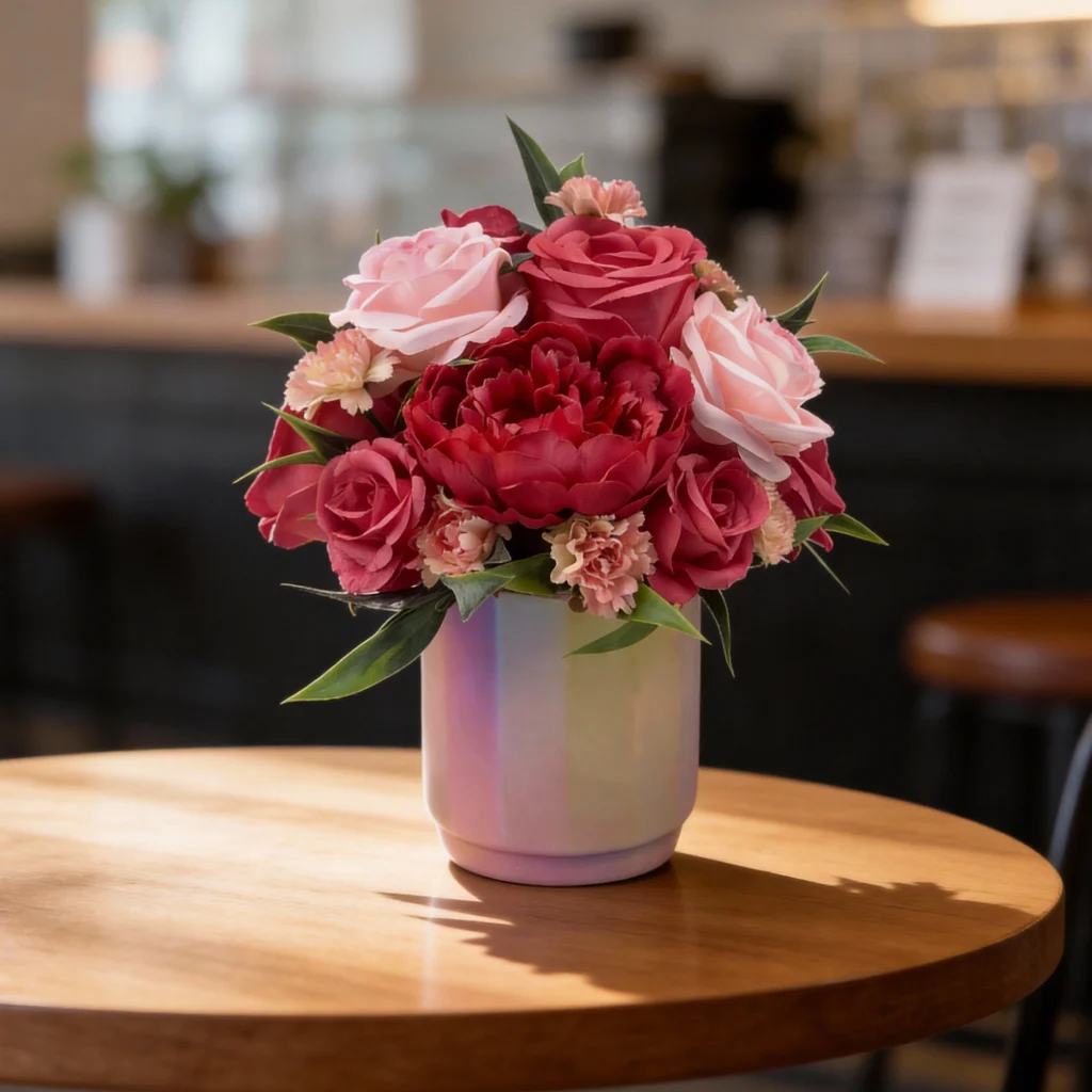 This 27cm Artificial Pink Flowers Arrangement blends roses, red peonies, and pink carnations in a low pink ceramic vase with subtle iridescent finish. Designed as a small tabletop decorative piece, it creates a joyful, romantic, and festive pink atmosphere.