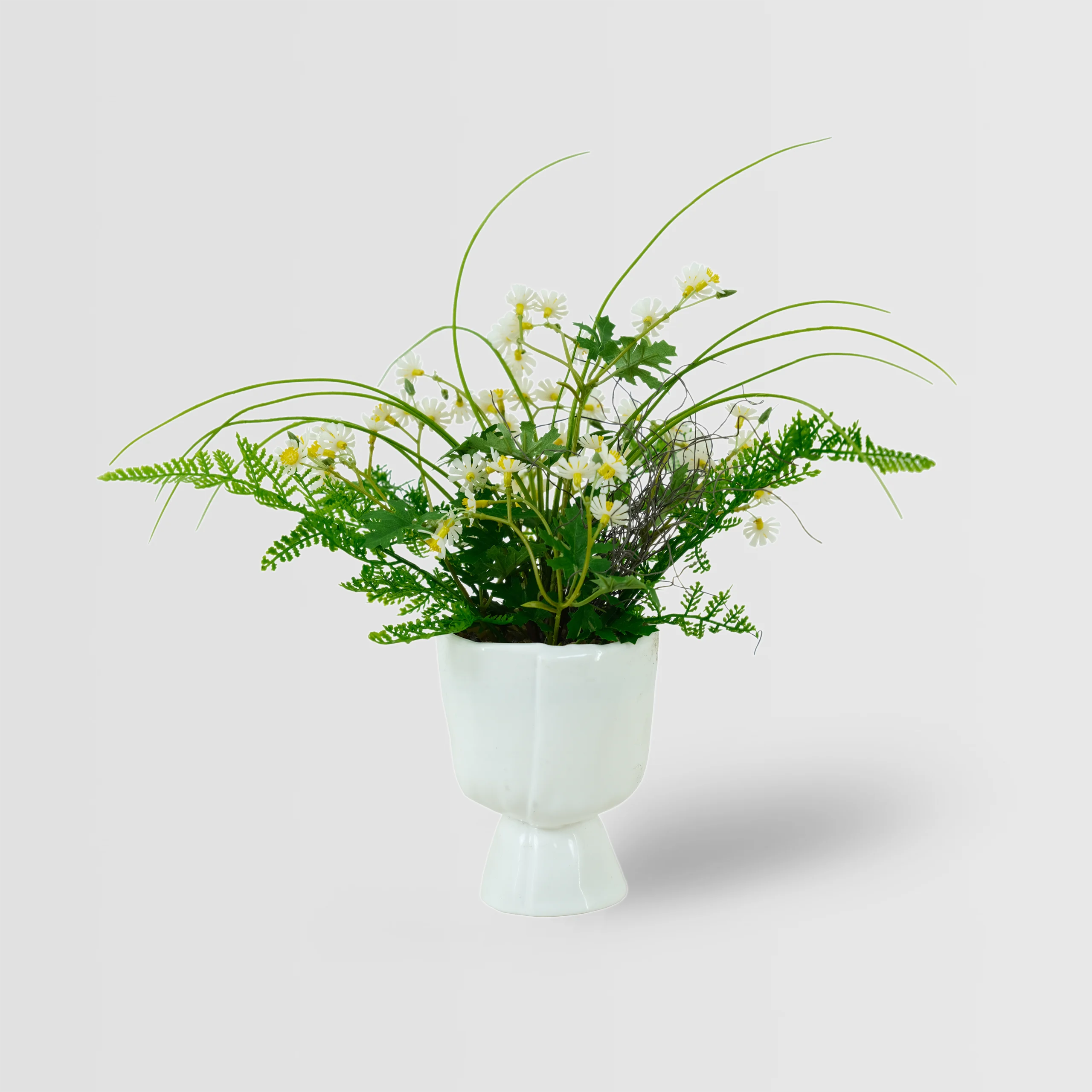This 28cm Artificial Daisy Potted Plant features small white silk daisies paired with decorative faux fern foliage, arranged in a white ceramic pedestal vase inspired by goblet-style design. Compact yet visually expressive, it delivers a refined artistic touch while maintaining a clean, natural look—perfect for modern interiors.