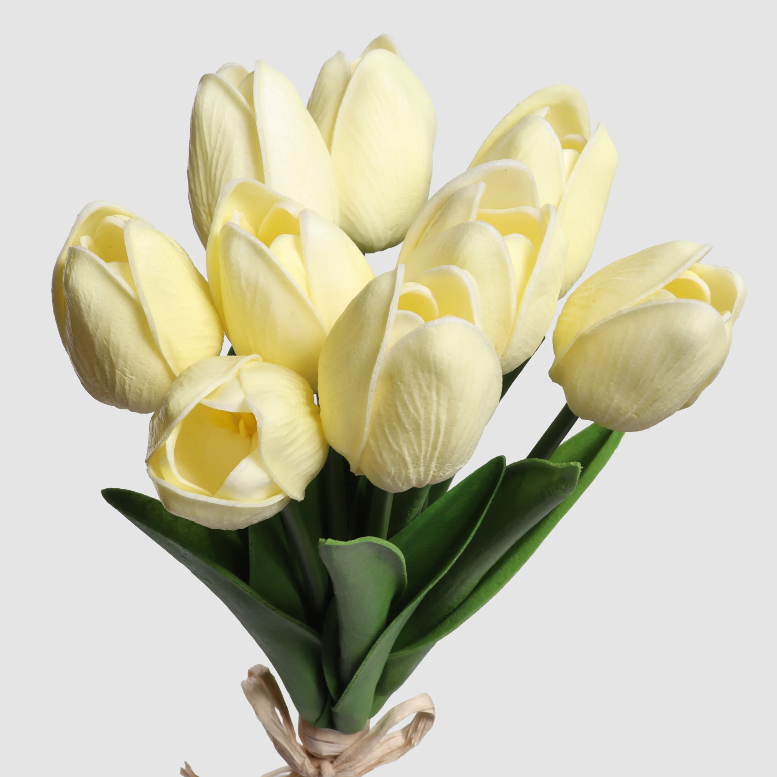 This 34cm PU Tulip Bundle features nine delicately shaped tulip blooms in a soft cream-white tone. The real touch material gives the petals a natural feel, while the compact bouquet structure makes it ideal for ready-to-use floral arrangements and retail flower bouquets.