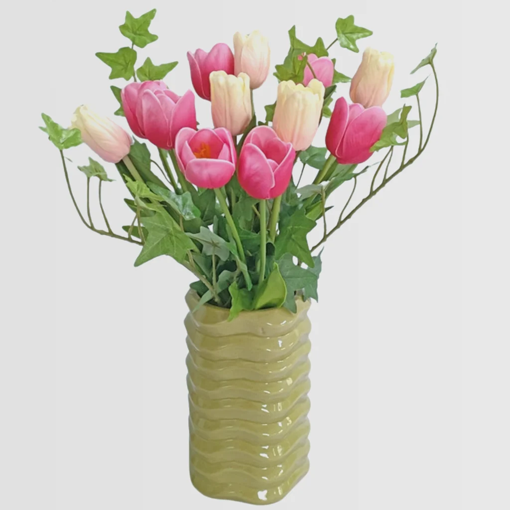 • Material: PU tulip flower + plastic leaves+ beige ripple ceramic vase