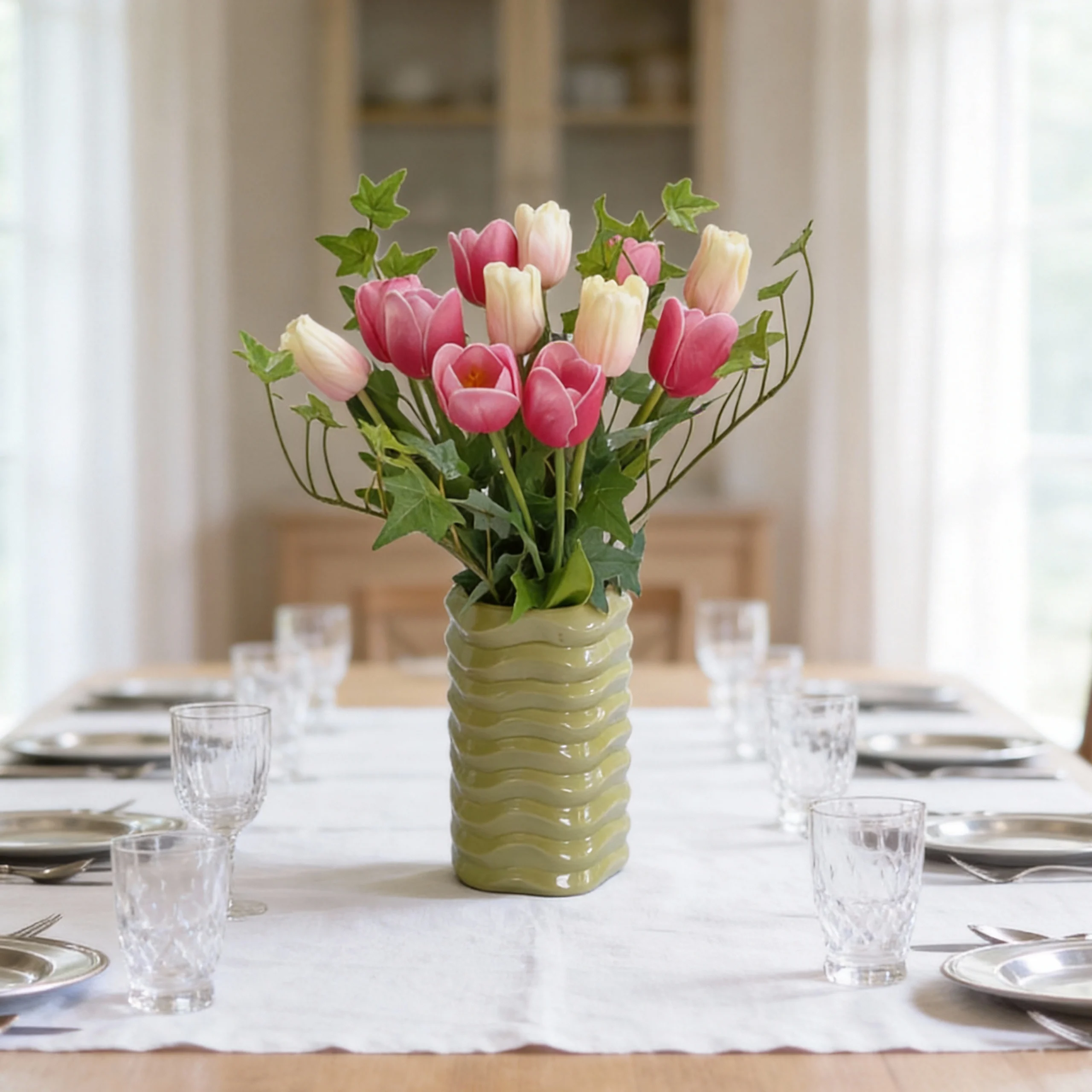 This 38cm Artificial Tulip Flower Arrangement features deep pink and blush tulips arranged in a beige ripple-textured ceramic vase. With its gentle color transitions and balanced proportions, it offers a medium-size decorative solution ideal for spring–summer interior styling.