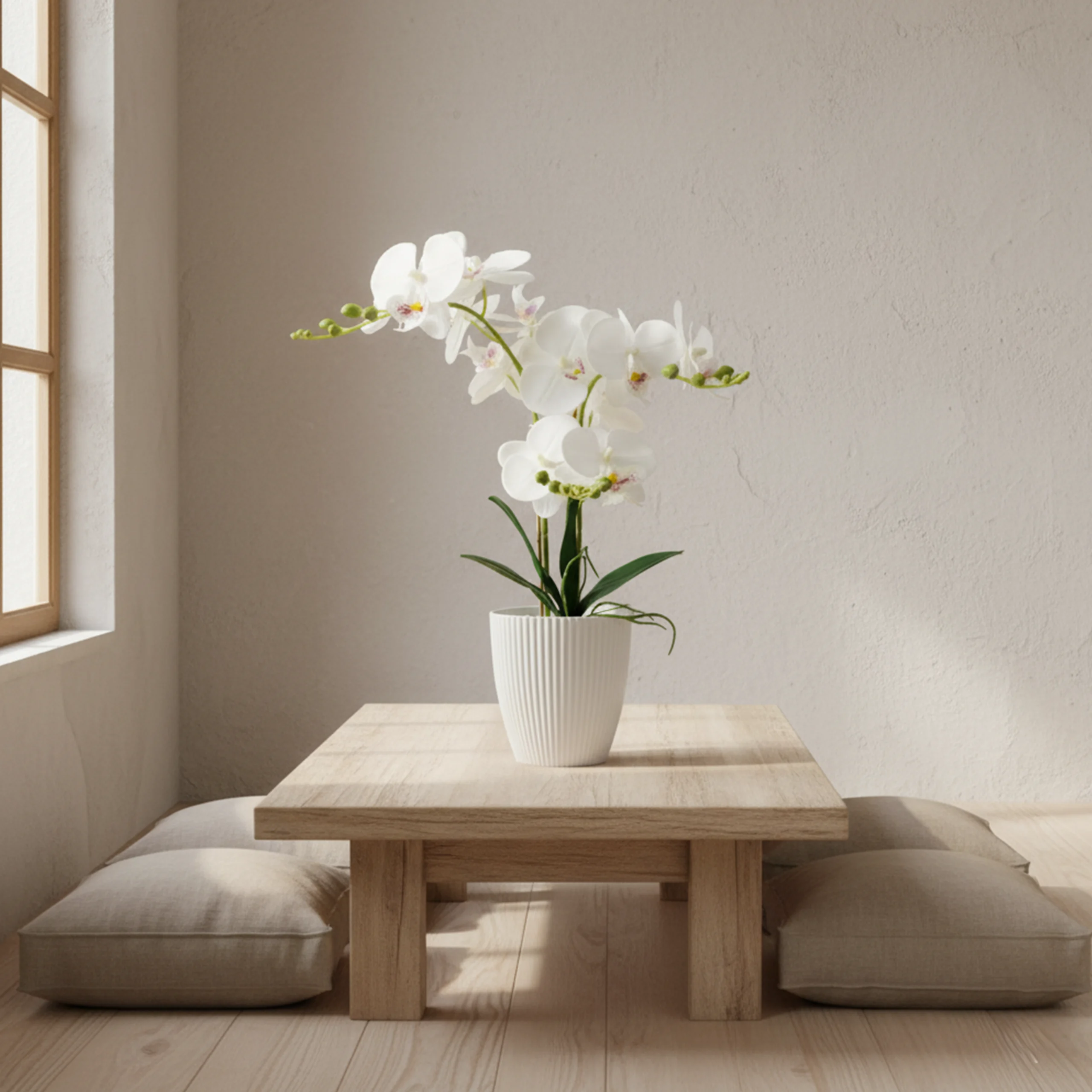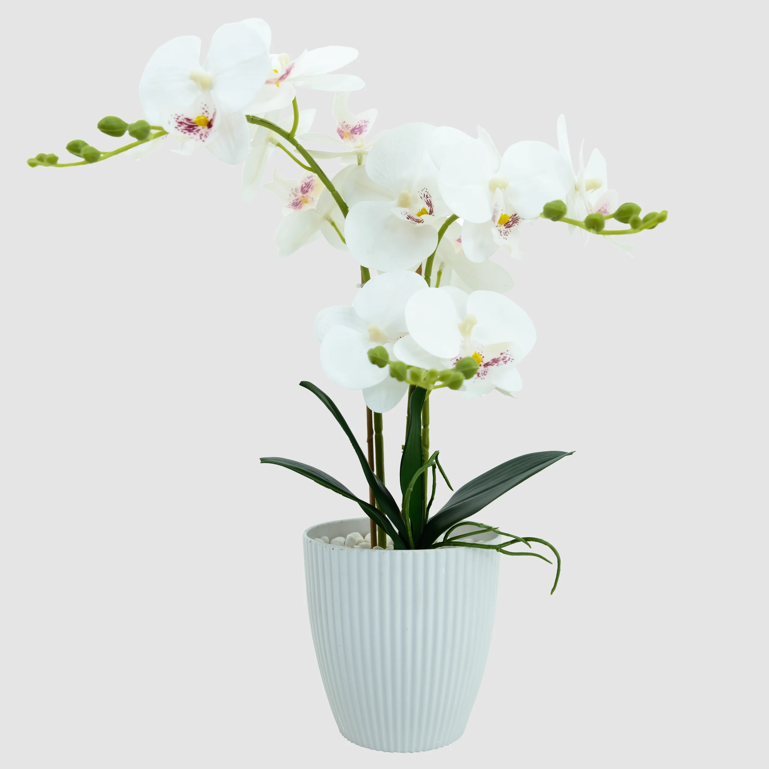 This 45cm Artificial 3-Stem Orchid Bonsai features elegant orchid blooms arranged in a modern white planter with decorative white pebbles. The layered stems create a full yet refined floral display that works beautifully for home decoration, reception counters, hotel lobbies, and tabletop centerpieces.