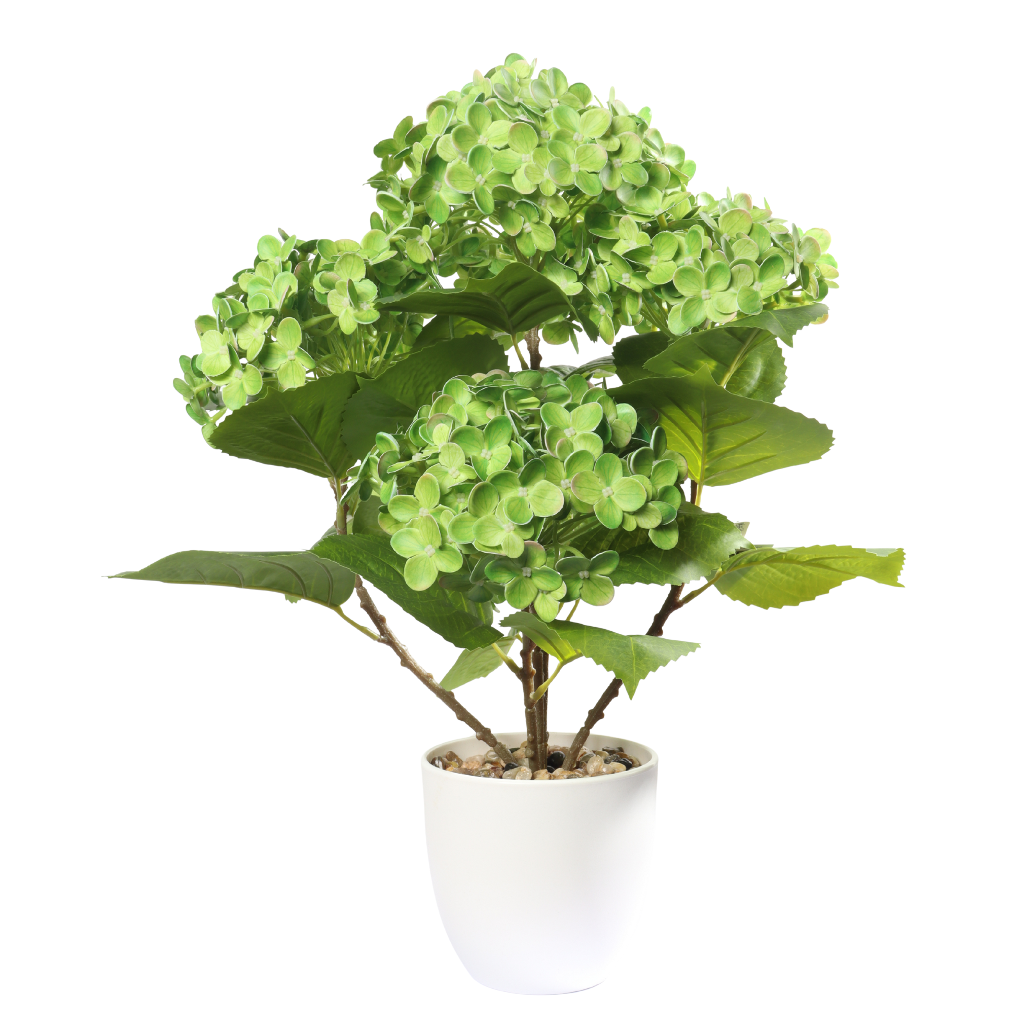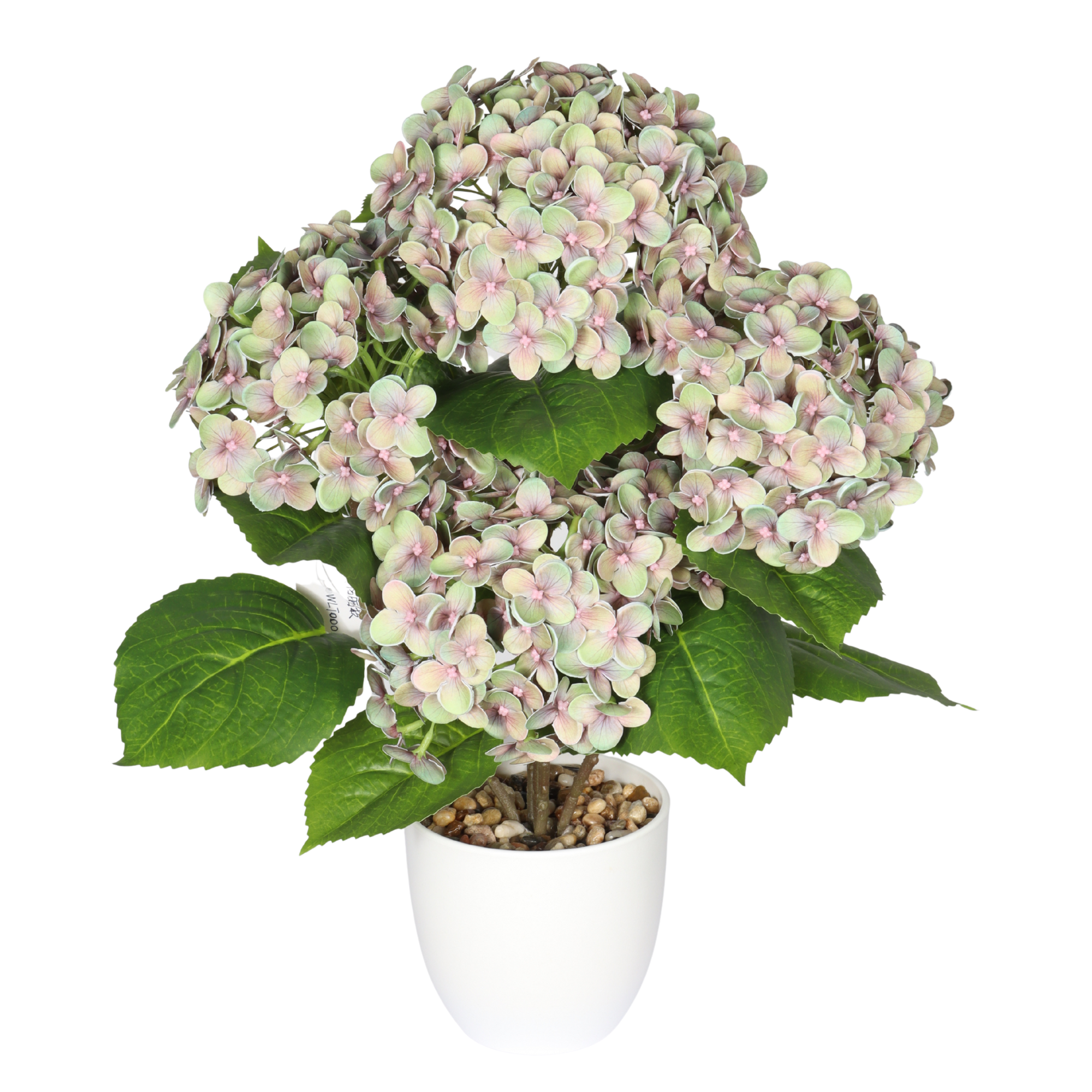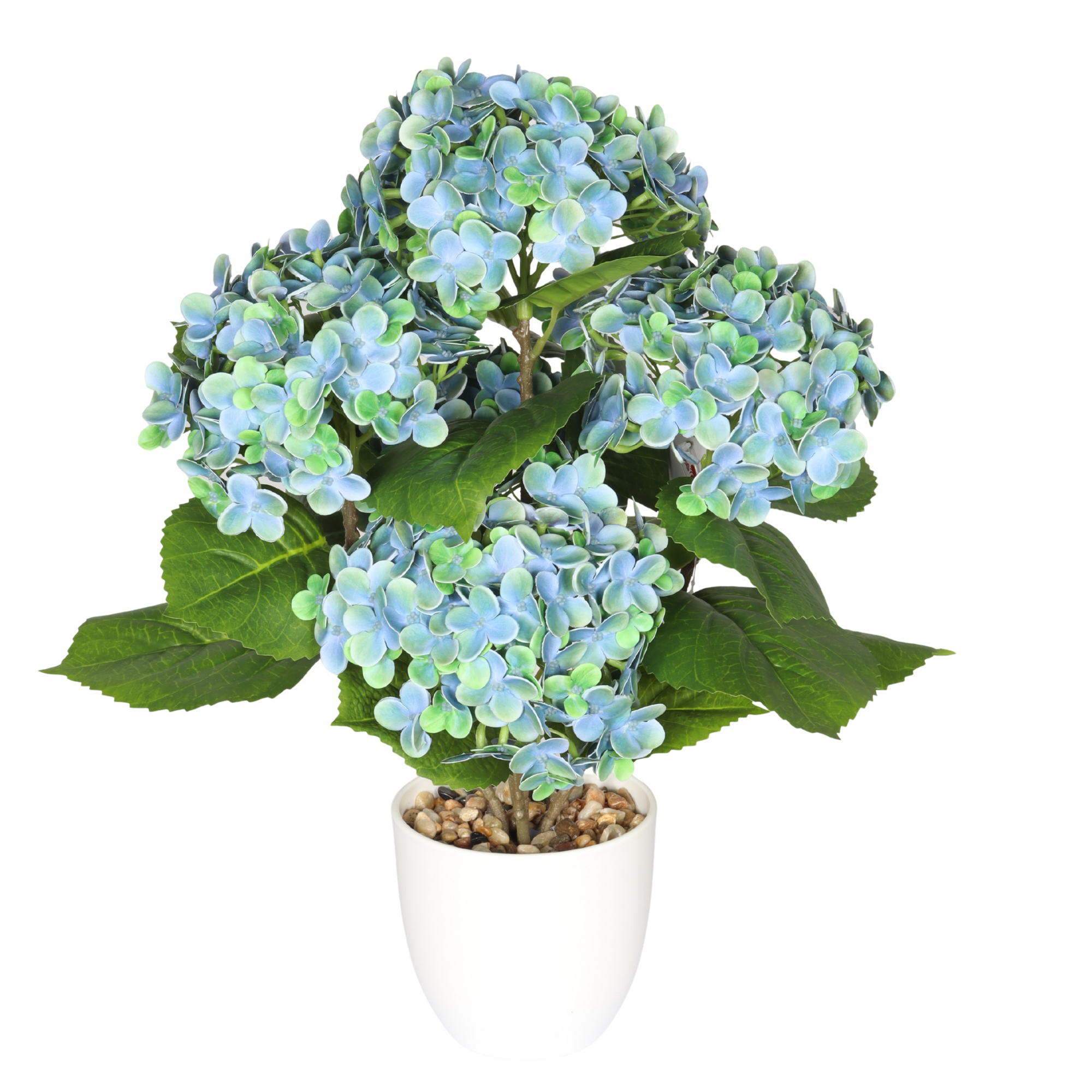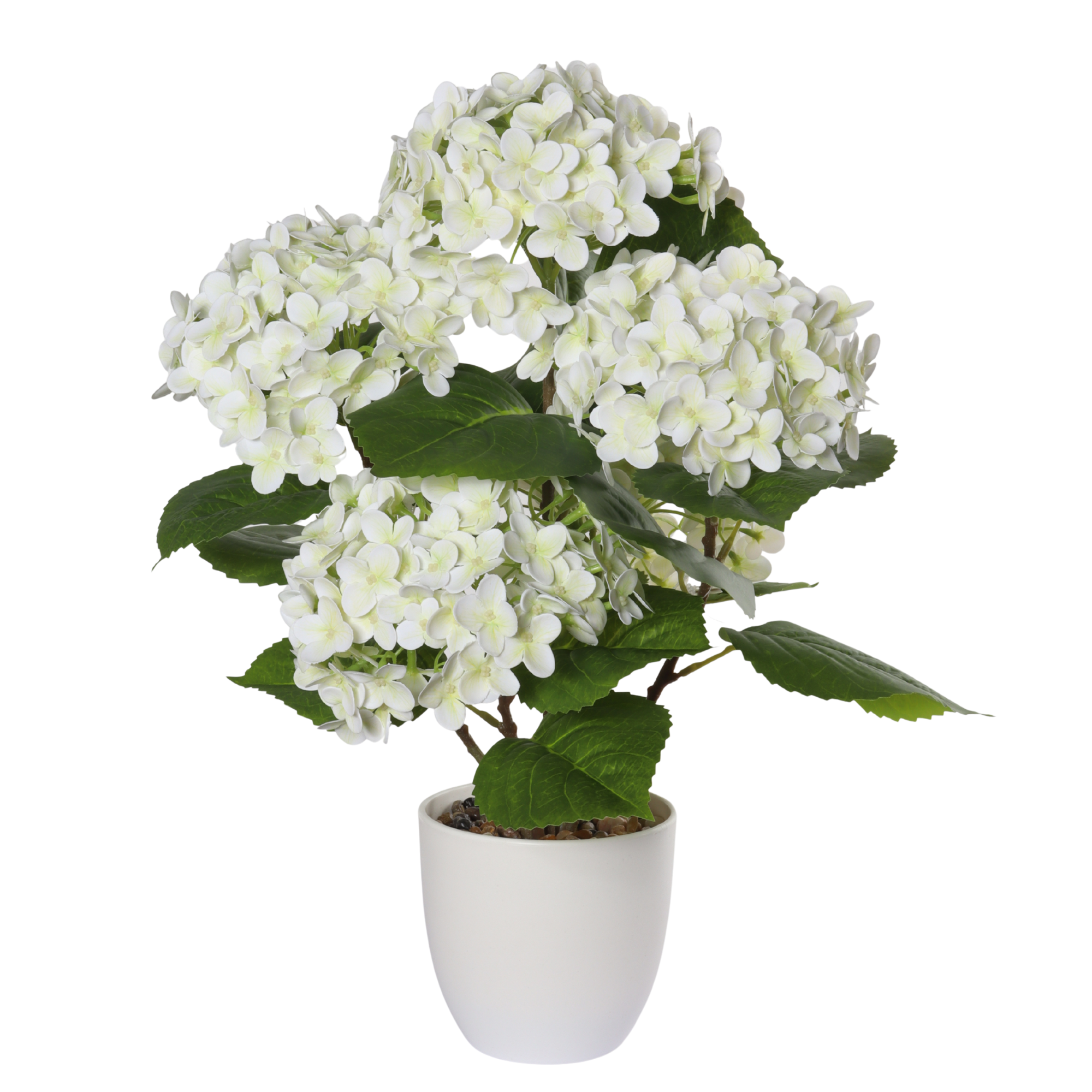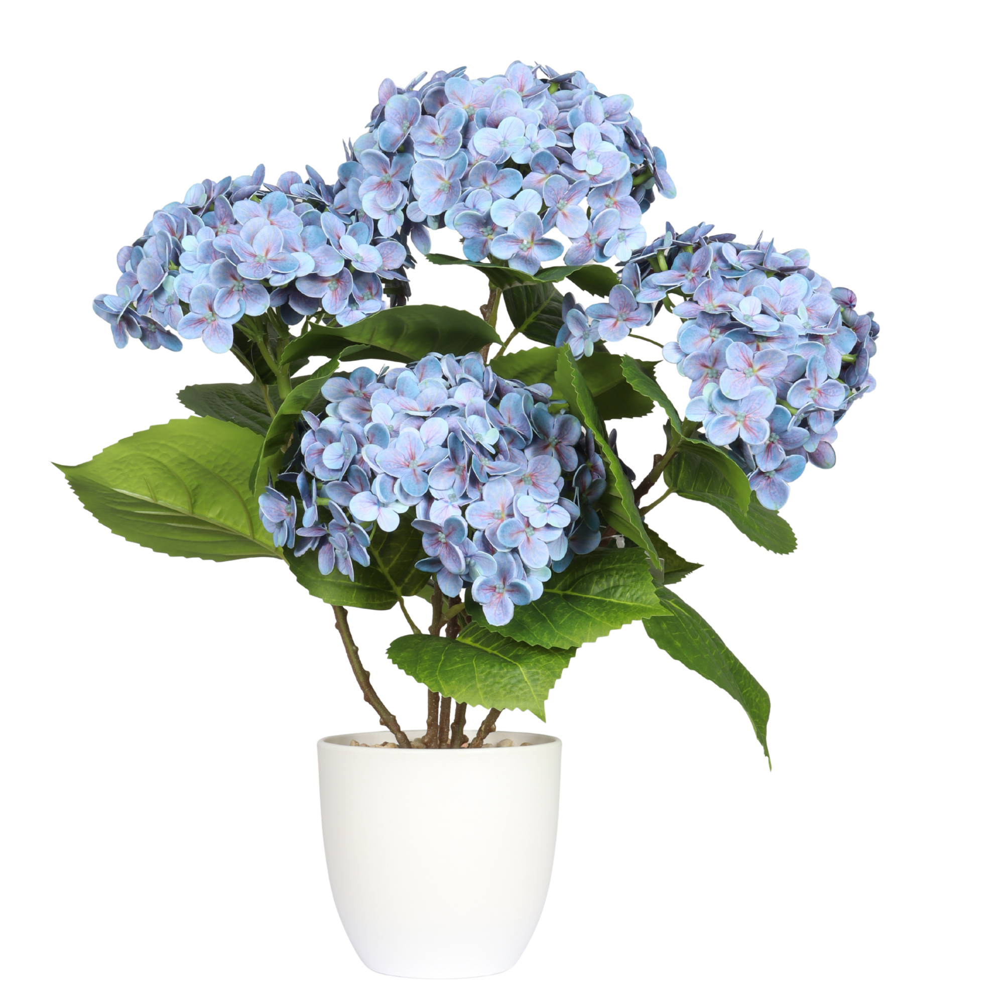 • Material: UV-resistant artificial hydrangea flowers + white plastic pot