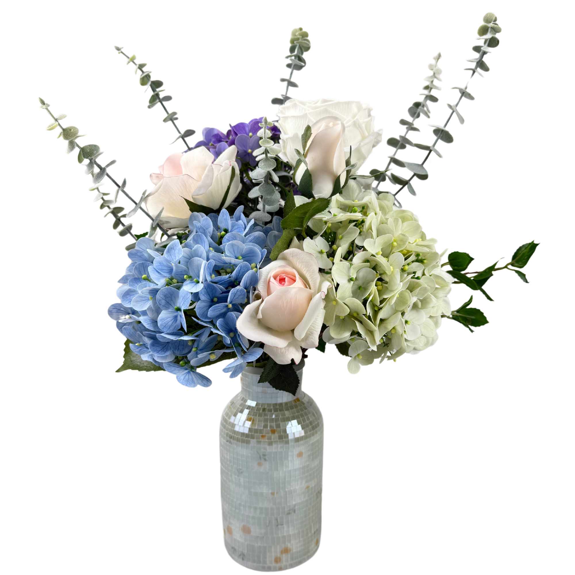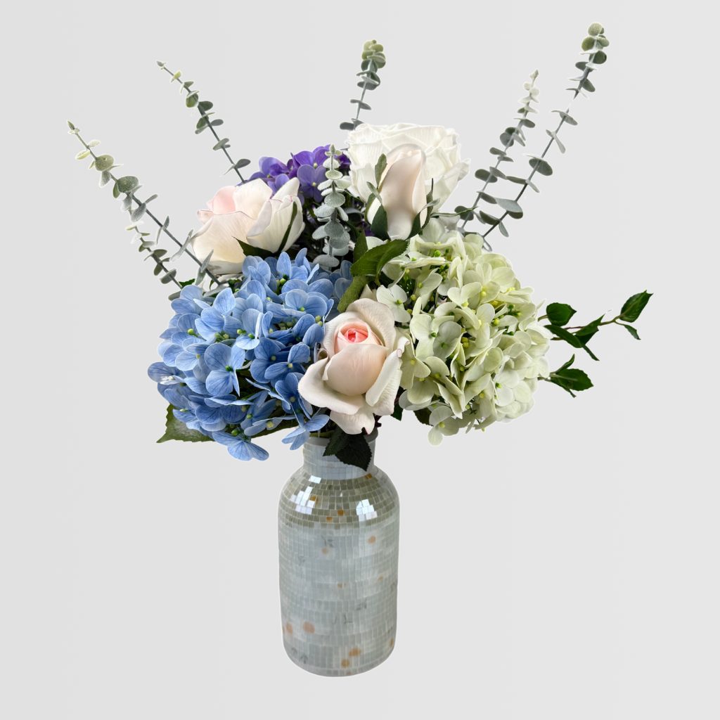 This 52cm Artificial Flower Arrangement features a luxurious blend of cool-tone hydrangeas and soft pastel roses, accented with lush green foliage for a full, balanced composition. The arrangement is set inside a high-end ceramic vase with mosaic patchwork texture, creating a refined decorative piece suitable for upscale interiors and commercial environments.
