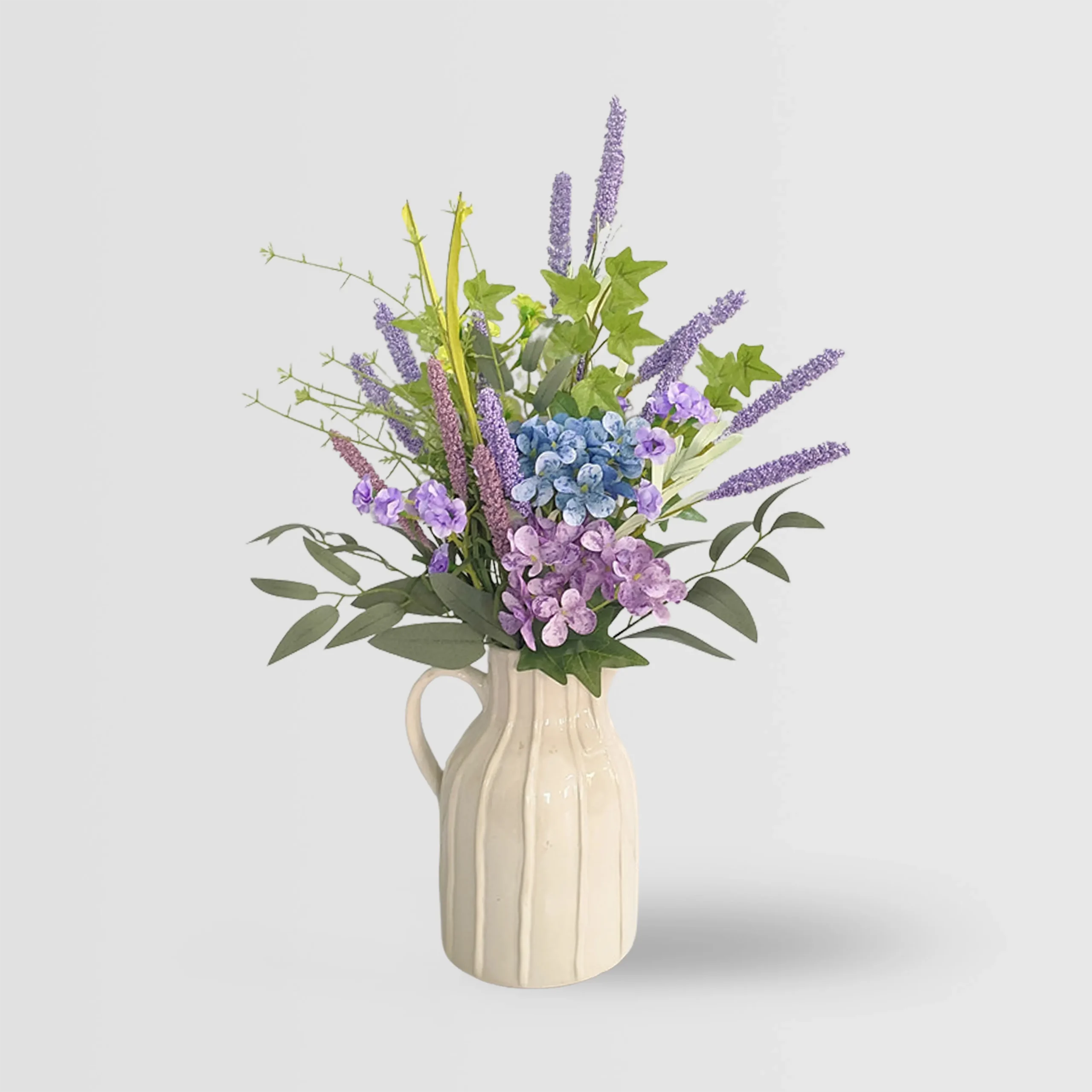 This 53cm artificial flower plant captures the calm charm of countryside lavender fields with a graceful blend of soft blue hydrangeas, delicate violet blooms, and lavender-like florets arranged in a vertically textured ceramic pot. The overall composition delivers a clean, natural, and minimalist aesthetic—ideal for high-end interior projects seeking visual consistency and long-lasting beauty.