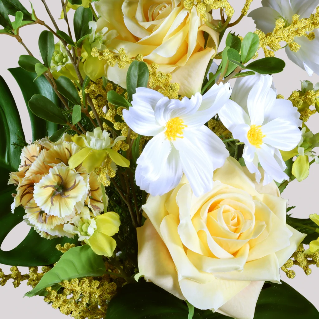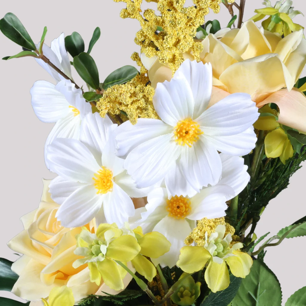 This 60cm Artificial Cosmos Flower Arrangement combines white and yellow roses, star-shaped blooms, cosmos flowers, and layered greenery including monstera and olive leaves. Set in a tall white frosted ceramic vase, it delivers a fresh, energetic spring–summer aesthetic with strong visual presence.