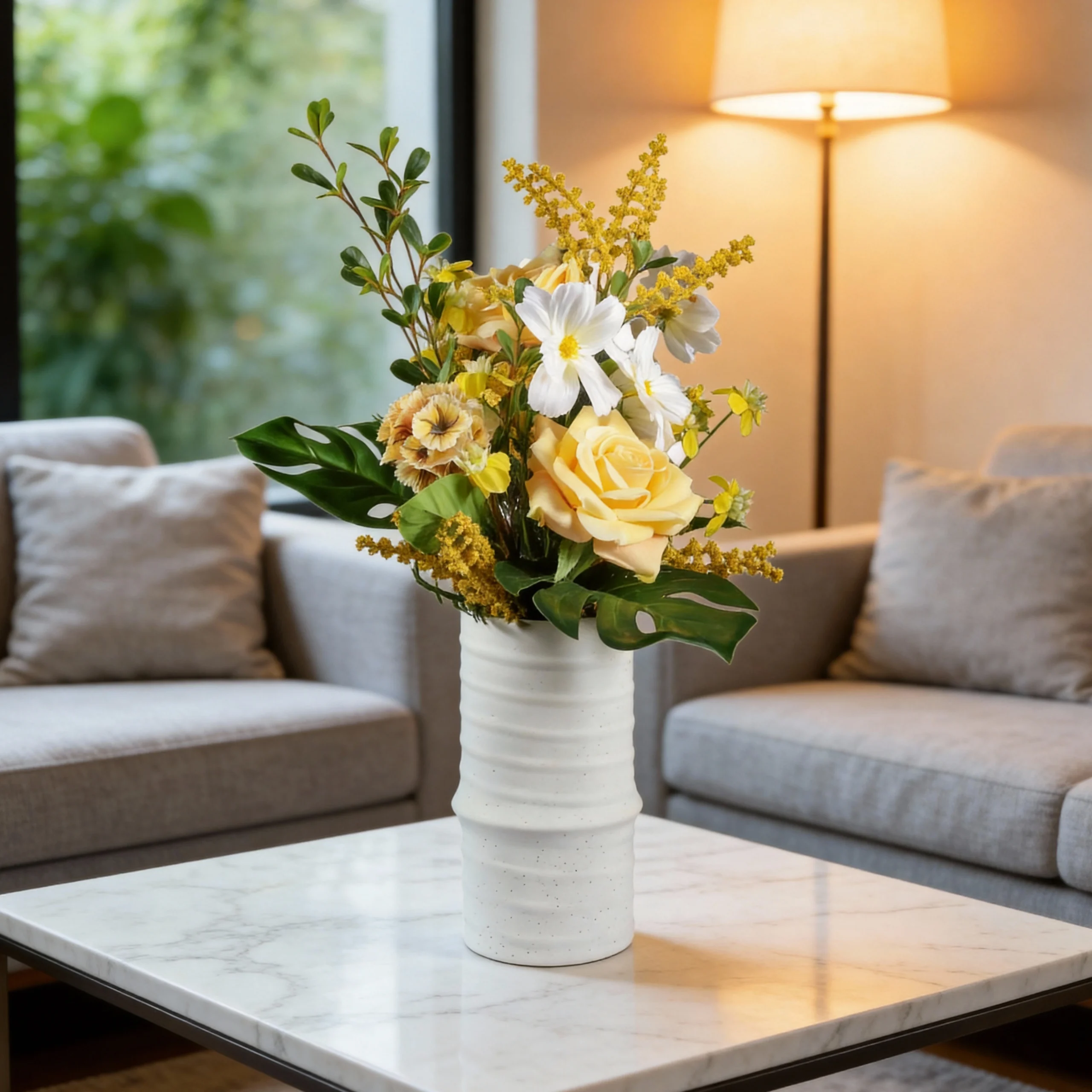 This 60cm Artificial Cosmos Flower Arrangement combines white and yellow roses, star-shaped blooms, cosmos flowers, and layered greenery including monstera and olive leaves. Set in a tall white frosted ceramic vase, it delivers a fresh, energetic spring–summer aesthetic with strong visual presence.