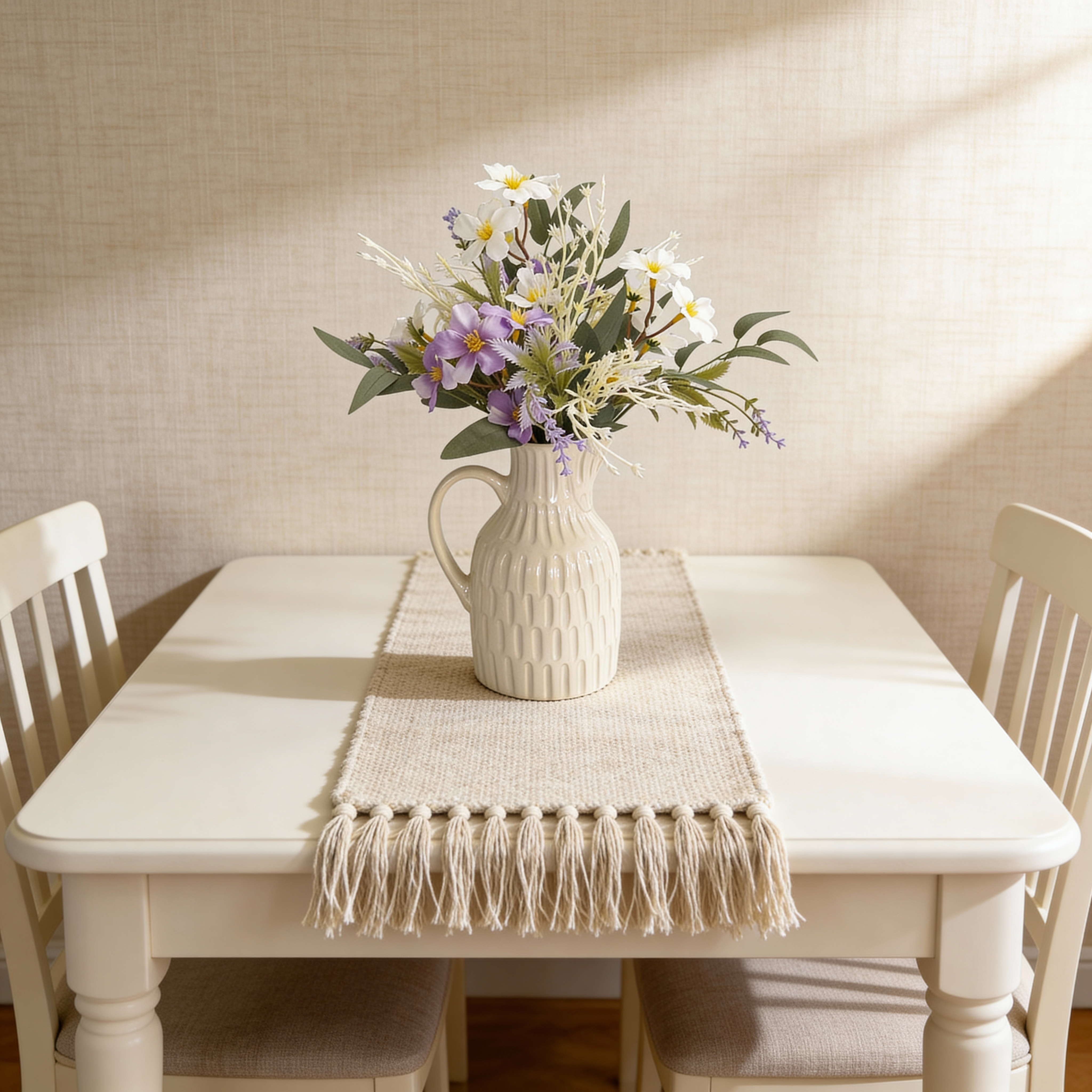 🌸 Elegant faux blossoms including lavender-toned accents and creamy silk florals