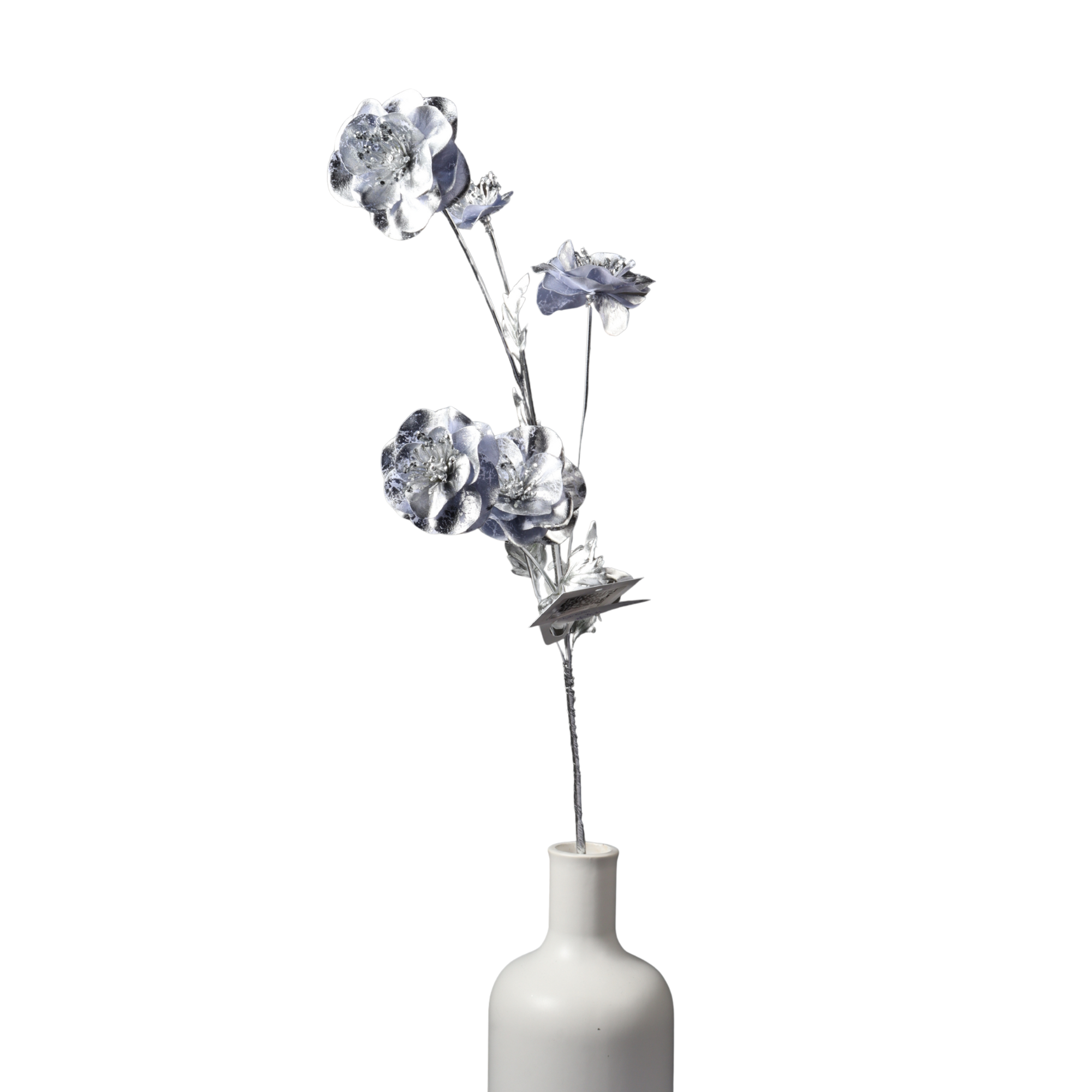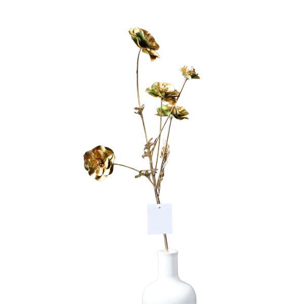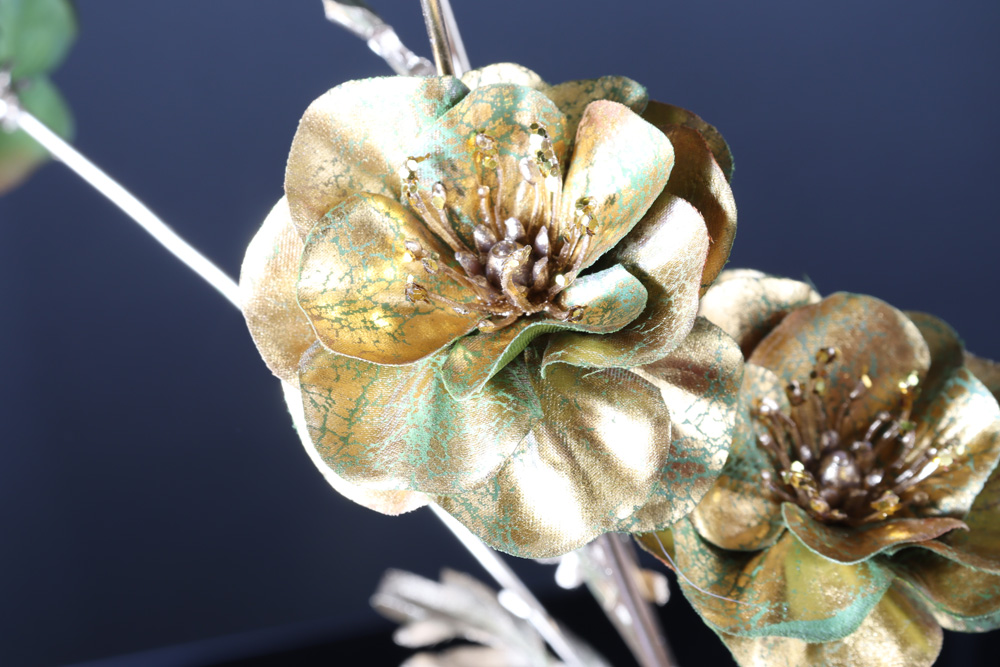This 74cm artificial Christmas camellia rose branch radiates holiday luxury with its delicately applied gold and silver glitter finish. Each bloom captures the softness of silk petals while reflecting a gentle, festive shimmer under light—making it the perfect statement piece for winter floral programs.